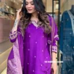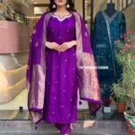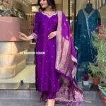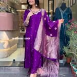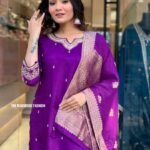 Crafted from rich Dola Silk, this outfit showcases a smooth texture with a subtle sheen that adds timeless elegance. The graceful drape and luxurious feel make it perfect for festive occasions, weddings, and special celebrations.